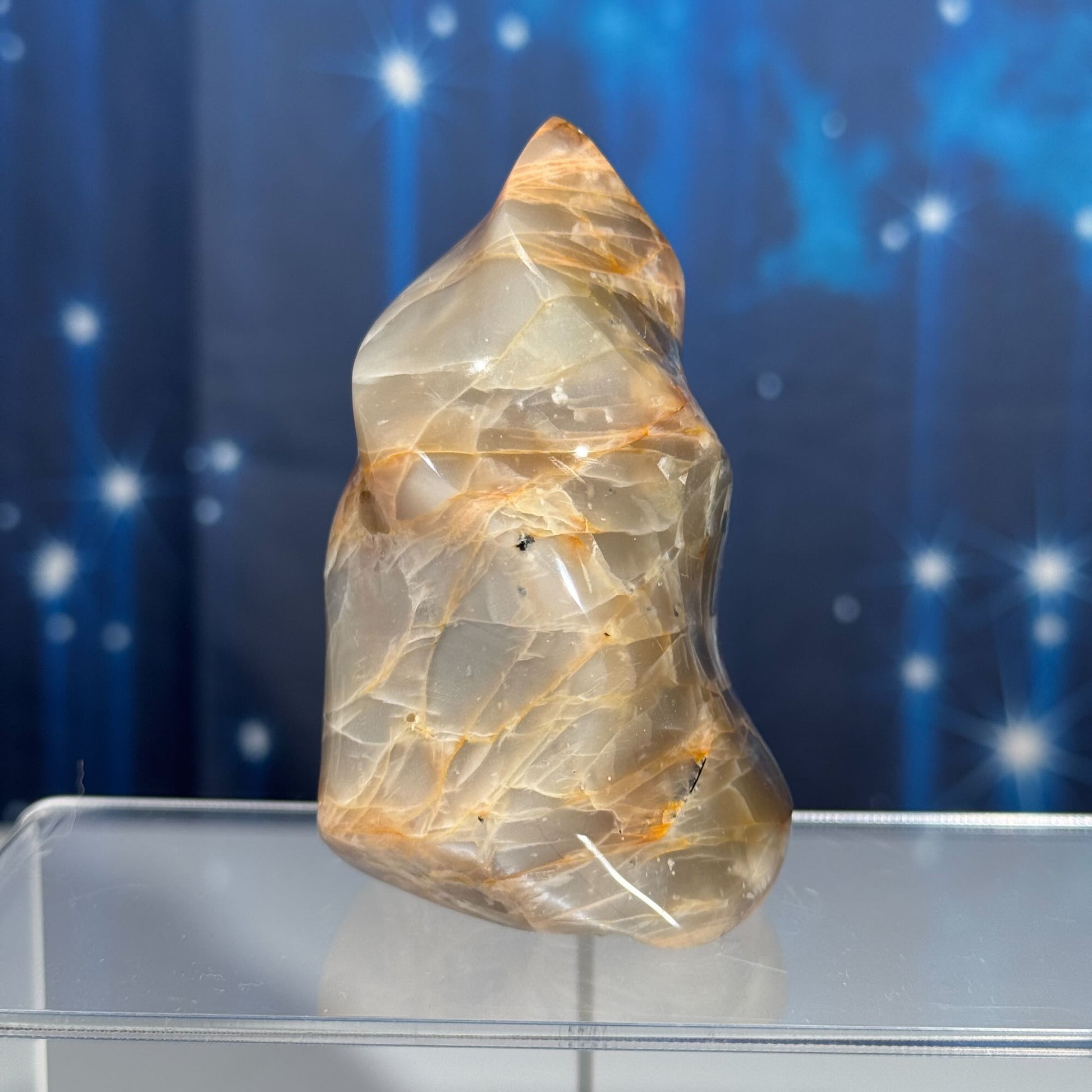Flashy Black and Peach Moonstone flame with Sunstone